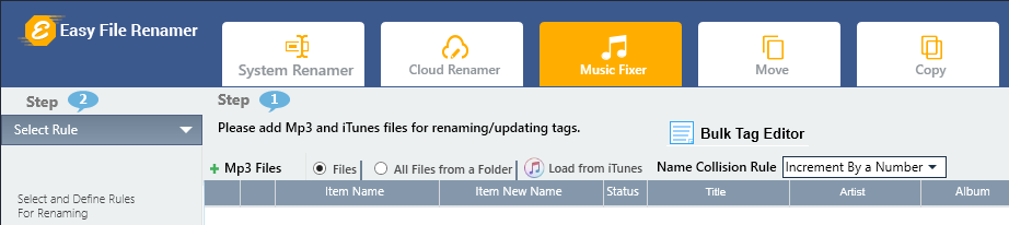 Rename MP3 Songs and Edit Album Art November 4, 2019December 23, 2024 Raza Ali Kazmi Metadata, Rename Data Organizing data in an efficient manner gets half the job done right away. It makes the task of fetching the right file a lot easier and quicker, and you get to increase your productivity big time. Sounds all good. But how do we organize data? A major part of it relates to naming the data properly so that it can be easily identified. Naming the data contains diverse meanings, which vary with the file type concerned. Today we will be looking at how to easily and effectively rename MP3 files. We will also be looking at how to add/ edit the Album Art image for the MP3 songs. And then there will be a surprise package at the fag end. So let’s begin. Renaming MP3 Files This has to be the most important part of the organizing process. A clear, and meaningful name given to a file makes life a lot easier. Tracing a particular MP3 song either by typing its name in the Search box (in the File Explorer) or otherwise gets done very quickly if it is named correctly. But if you were to stumble across an MP3 that contains total gibberish in the filename, how would that go? A neat example can be an MP3 song that contains the website name from which you downloaded it followed by the year of its release (xyz.com 2019). You simply cannot tell which song it is until you play it. That’s a problem. Now imagine searching for a particular song from a crowd of hundreds (or a lot more) songs that are named in the same pattern. That’s a total headache! Changing the Album Art And then comes the Album Art. This is the graphic that you see on the screen of your audio player while playing the song and also shown in the thumbnail of the song in the File Explorer. This field is often left empty or it contains the logo of the website you downloaded the song from. If you want to use the right image for the album or the movie this song belongs to (or even an image of your choice), we’re here to help you out. Easy File Renamer Here comes Easy File Renamer. This is state-of-the-art software that is perfect for all kinds of file renaming needs. It contains 10 renaming rules for files (and folders). Now let’s get back to our theme of remaining MP3 songs. The software uses the same 10 renaming rules and 4 additional MP3 specific renaming rules to provide you a larger pool to choose from. Other than renaming MP3 songs, it also helps fix the Album Art. It performs both these (and many more) jobs accurately, quickly, and without making the task difficult or lengthy in duration. And of course, it is totally reliable, and light on system resources. Easy File Renamer has a neatly laid out interface and is the right choice in all aspects. Let’s now head to the detailed solution. Head over to the Easy File Renamer website and download the setup file. Execute the setup file to install the software and launch the software when the installation is over. Select the Music Fixer tab. Click the MP3 Files button and then add as many files as you want. Now click the Select Rule dropdown menu on the left and choose the renaming rule of your choice. The Renaming rules If you scroll down a little further than the Uppercase rule, you will see the MP3 Name Pattern option. Select it and you will see this secondary dropdown menu appear within the Select Rule area. Click this new dropdown and you will get the 4 MP3 specific renaming rules. The MP3 specific renaming rules Now select the rule of your choice. Some rules will require you to enter text in a textbox (e.g. you have to enter the specific text you want to remove using the Remove Text rule) and choose the option of your liking (Remove First, Remove Last and Remove All). Click the Add Rule button to add this rule for the renaming process. And by the way, you can happily add several rules to be applied in a single renaming operation without any issues at all. Note the Item Name and the Item New Name columns. The files under these columns are giving you a glimpse of how this software works. We have opted to delete the letter n from the file names, so Song 1.mp3 becomes Sog1.mp3 and so on. You can select the other renaming rules as well to see how they work. It’s all very simple. And now we turn towards editing the Album Art. If you want to edit this image for a single song, click the orange pencil icon just before the song’s name in the software interface. If you want to use a single image for more than 1 song, select the songs and click the Bulk Tag Editor button. This will now open up the Single File Tag Editor or the Bulk Tag Editor window (as applicable). Editing the metadata Simply click the Edit Image or Add button to add the Album Art image from any location on your computer. Click Update to apply the Album Art image change. As you might have guessed by now about the surprise package, all the other metadata fields visible in these windows help add value to the MP3 songs. This is yet another nice way to organize your MP3 collection. We still need to apply the file rename rule we had selected earlier. Simply click the Rename button in the right-bottom of the user interface and give your consent to the software perform the MP3 song renaming. That’s it, guys. We’ve seen in some detail today how we can rename MP3 songs and edit the Album Art to give a more neat and organized look to our MP3 collection. We hope you found this article informative. What are your file/ MP3 renaming issues? Do you want any specific features added in the Easy File Renamer software? Please let us know by sending an email to info@easyfilerenamer.com.